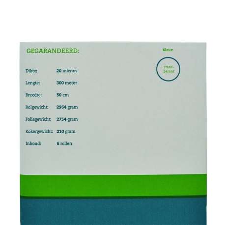 Breedte: 50 cm Lengte: 300 m Dikte: 20 my Kleur: transparant Prijs per: rol